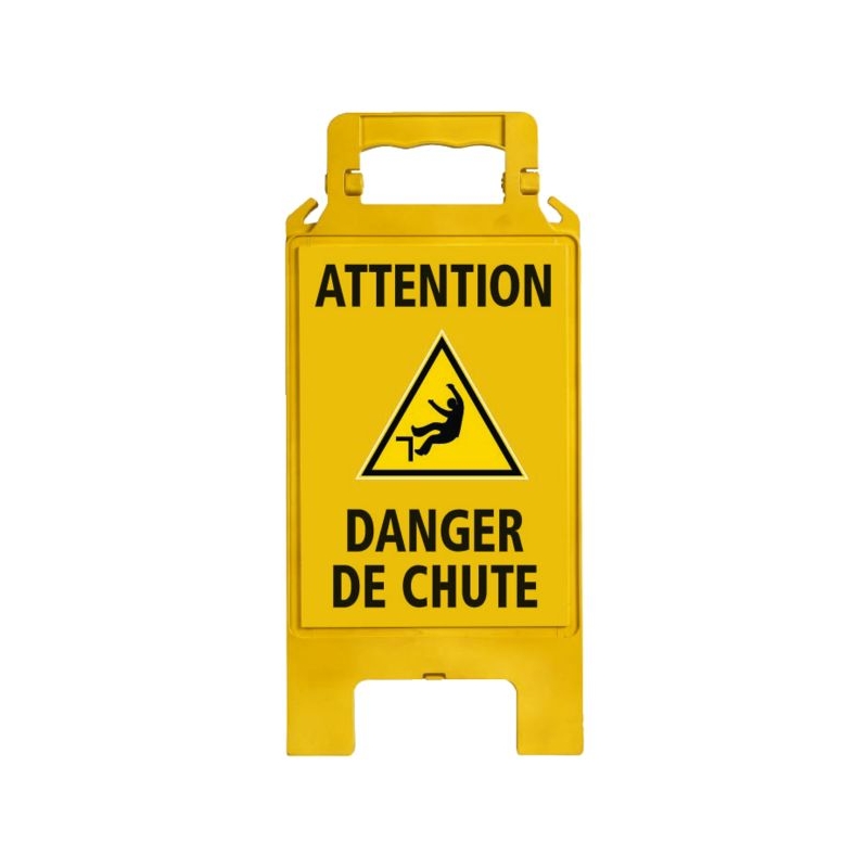En polypropylène avec renforts de maintien. Utilisation temporaire intérieure et extérieure. Poignée ergonomique, large surface d'impression. Clip de maintien en position ouverte, grande stabilité. Crochets pour chaîne de signalisation. H x l : 600 x 275 mm Épaisseur (plié) : 23 mm