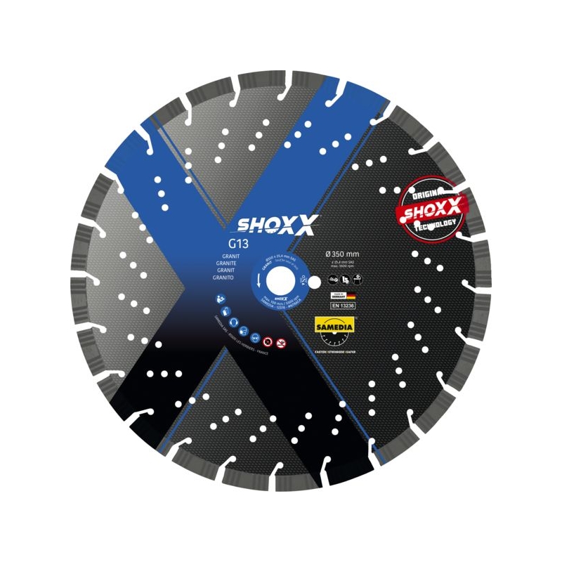 Pour une coupe ultra-rapide dans le granit et les matériaux très durs. Segments soudés au laser. Hauteur diamantée : 13 mm Norme : EN 13236