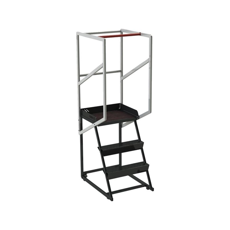 En acier mécano soudé, spécialement conçu pour les espaces restreints et passages étroits. Marches autoporteuses antidérapantes, garde-corps de sécurité et plateforme en tôle alu larmée antidérapante. Équipé de lisses et sous-lisses pour une plus grande sécurité. Réf. 22550-4 et 22550-5 équipées de stabilisateurs orientables et d'une barre anti-chute. Dimensions plateforme : 408 x 480 mm Conforme à la norme EN 131. 85% recyclé, 95% recyclable