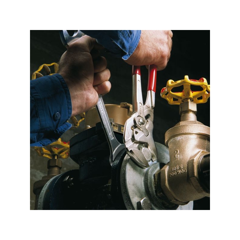Remplace tout un jeu de clés plates, métriques et en pouce. Mâchoires lisses n’endommageant pas les supports. Réglage par simple pression du bouton. Poignées gainées en PVC.