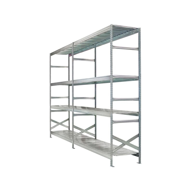 Entièrement galvanisé, composé de 4 niveaux pour charges mi-lourdes ou volumineuses avec tablettes réglables au pas de 33 mm. Montage sans vis ni boulon. Échelles livrées montées avec pieds métalliques. Livré démonté. Charge par tablette : 530 kg H x L x P : 2500 x 1880 x 600 mm Autres dimensions nous consulter.