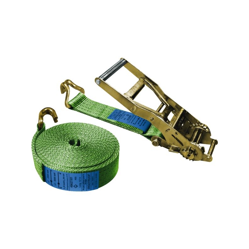 Arrimage 2 parties avec tendeur à cliquet inversé permettant une force d'arrimage maximale sans effort. Avec le tendeur traditionnel, il faut soulever le levier pour tendre la sangle. Sur le tendeur inversé, il suffit de baisser le levier pour effectuer la tension. TMU : 2500 kg Rupture de sangle : 7,5 t Longueur/largeur : 9 m/50 mm Norme : EN 12195-2