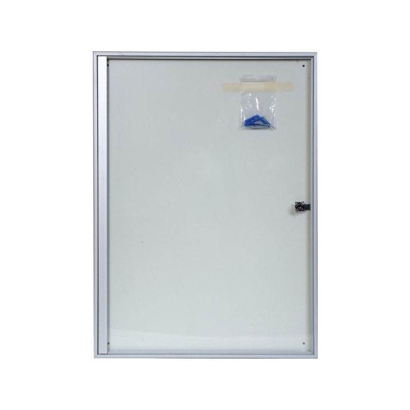 Porte battante, fermeture par serrure à clé avec pose à droite. Profil alu anodisé naturel, façade plexiglas avec entourage à partir du format 6 feuilles. Fond tôle blanc pour affichage magnétique. Fixation murale 4 points. Absence d'entourage de porte pour le format 4 feuilles. Épaisseur hors-tout : 20 mm Épaisseur utile : 12 mm